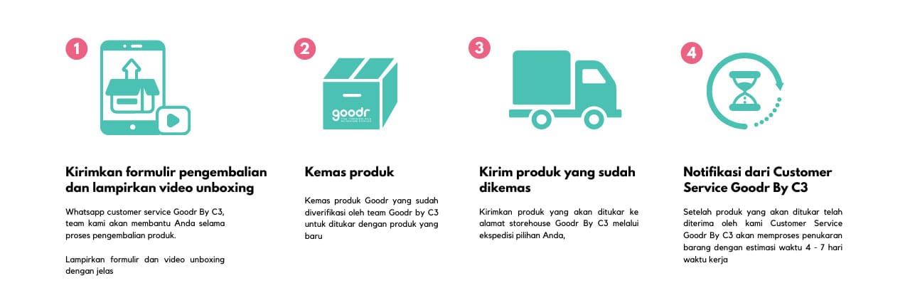 - Tunggu produk pengganti dari warehouse Goodr AUTHORIZED RETAILER by C3 dengan estimasi waktu 4-7 Hari