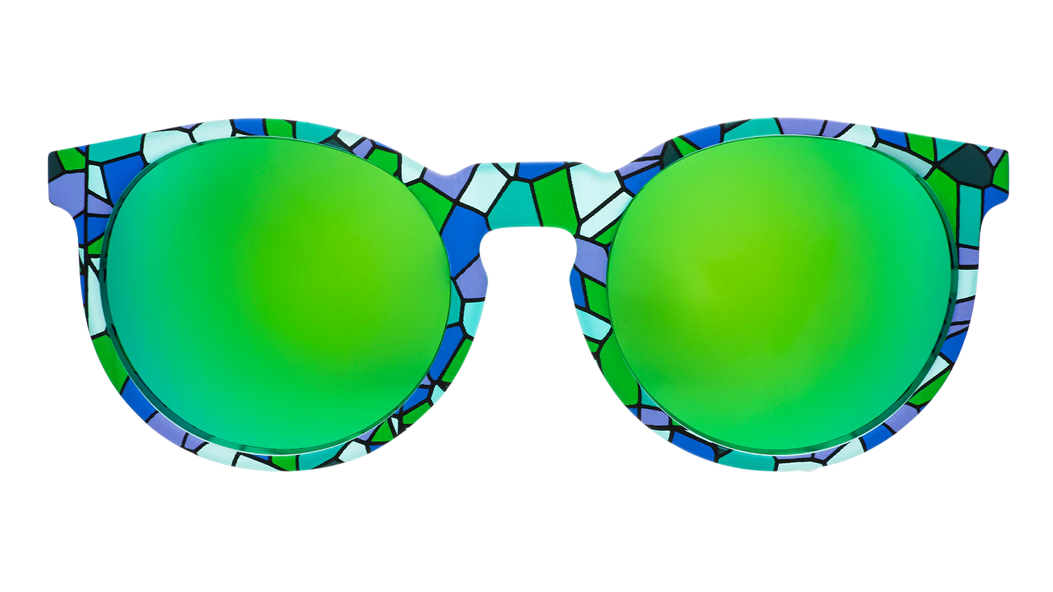 A beatnik appears on a hazy stage in stained glass-inspired teal Circle Gs w/ green reflective lenses to deliver slam poetry about the pitfalls of ugly, over-engineered active sunglasses. The audience snaps in support of their Moody Mosaic Musings.